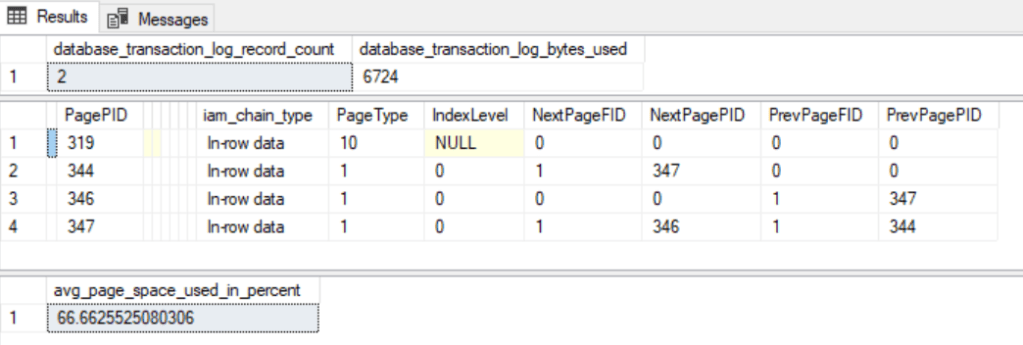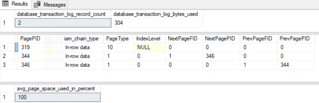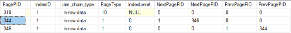 The following result shows two leaf level pages. In this particular test pages 344 and 346 were created. Note the link between pages by looking at NextPagePID and PrevPagePID.